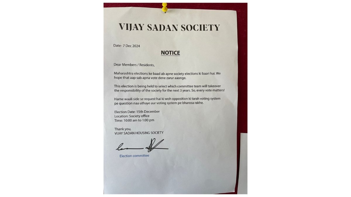 The notice humorously ties the upcoming society election to the recently concluded Maharashtra elections, stating, “Now that the Maharashtra elections are over, it’s time for our society’s election. We hope all members will exercise their valuable right to vote.”
