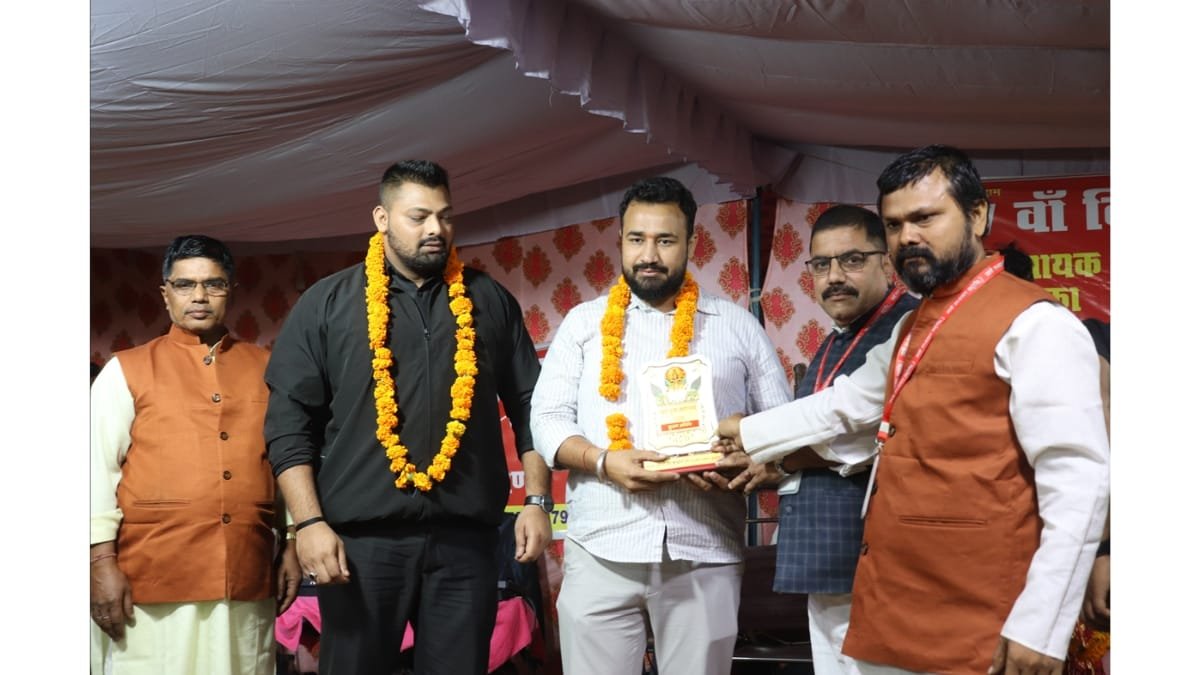 The award was presented by key members of Pravasi Jan Kalyan Sangh, including Tarkeshwar Rai (President), Alok Upadhyay (Vice President), and Rahul Pandey (General Secretary), in the presence of hundreds of attendees.